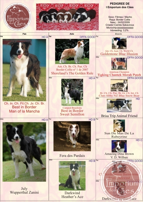 Teve seu DNA testado pela Optigen e é NORMAL para CEA (Collie Eye Anomally), ou seja, nunca terá filhos afetados por essa doença genética que afeta a visão dos Border Collies.
